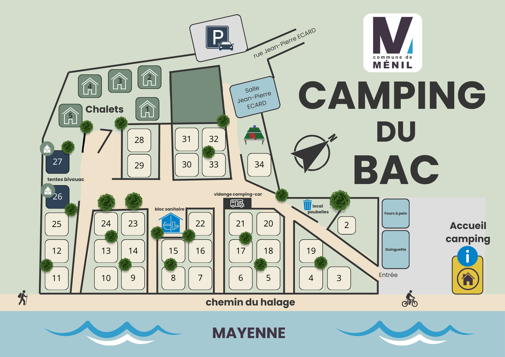 JE RESERVE BROCHURE 2026En bordure de rivière,dans un décor verdoyant, le Camping Municipal du Bac** de Ménil vous offre 32 emplacements ombragés ainsi que 5 chalets tout confort et 2 tentes bivouacs Le calme, la beauté du site, la pêche, la proximité du village, l'esprit de convivialité et l'activité culturelle sont les qualités les plus attrayantes de cet endroit touristique. Des espaces pêche où vous pourrez taquiner le vif ou le carnassier sont à votre disposition. Sa situation géographique en bordure de halage vous offre de belles balades à pieds, VTC ou à cheval . La proximité de « La Mayenne » offre un éventail d’activités nautiques. La commune de Ménil est située à proximité de curiosités patrimoniales que vous pourrez découvrir et qui contribueront à vous faire passer un agréable séjour. Possibilité de louer des pédalos de 3 et 5 places, canoës de 1 et 2 places, VTC et locations paddles à l'accueil du camping. -